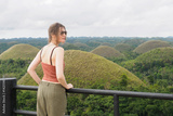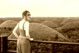 Cute women against the backdrop of Chocolate Hills in the wonderful island of Bohol, Philippines. Beautiful landmark. No people, outdoors. Concept of leisure and travel