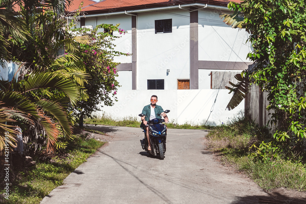 Attractive man riding a motorcycle. Sunny, clear day. Close-up, outdoors. Vacation and travel concept