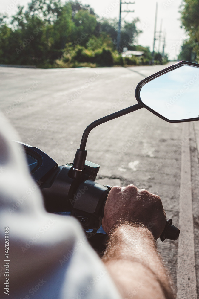 Attractive man riding a motorcycle. Sunny, clear day. Close-up, outdoors. Vacation and travel concept