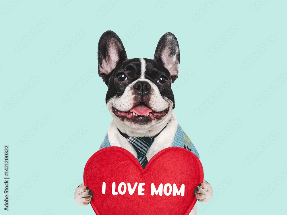 Cute puppy and sign with love words for Mom. Closeup, indoors. Studio shot. Congratulations for family, loved ones, friends and colleagues. Pets care concept