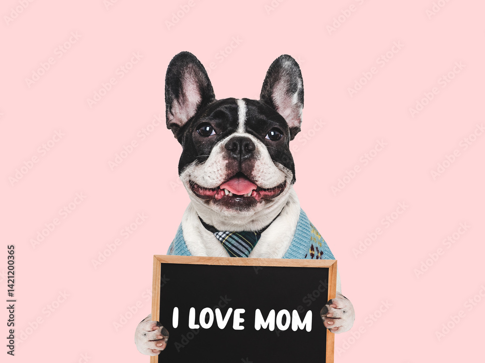Cute puppy and sign with love words for Mom. Closeup, indoors. Studio shot. Congratulations for family, loved ones, friends and colleagues. Pets care concept