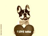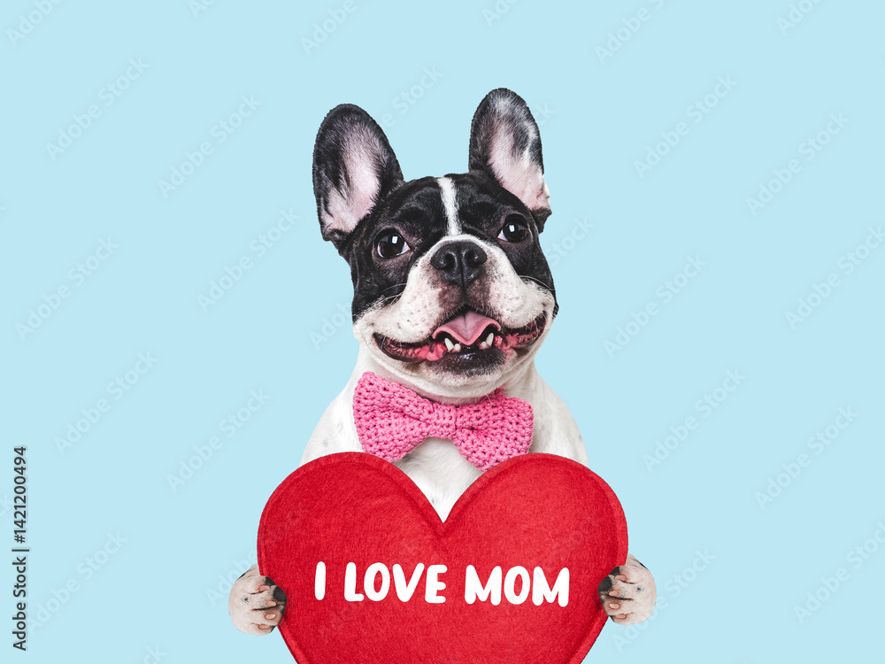 Cute puppy and sign with love words for Mom. Closeup, indoors. Studio shot. Congratulations for family, loved ones, friends and colleagues. Pets care concept