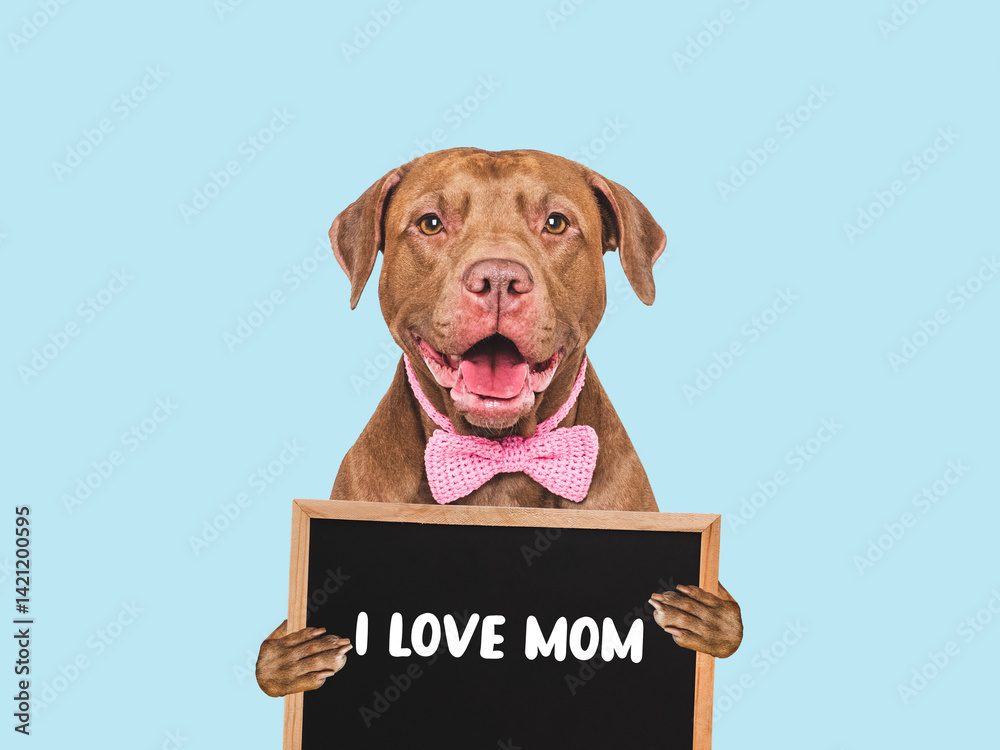 Cute dog and sign with love words for Mom. Closeup, indoors. Studio shot. Congratulations for family, loved ones, friends and colleagues. Pets care concept