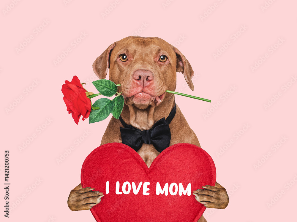 Cute dog and sign with love words for Mom. Closeup, indoors. Studio shot. Congratulations for family, loved ones, friends and colleagues. Pets care concept