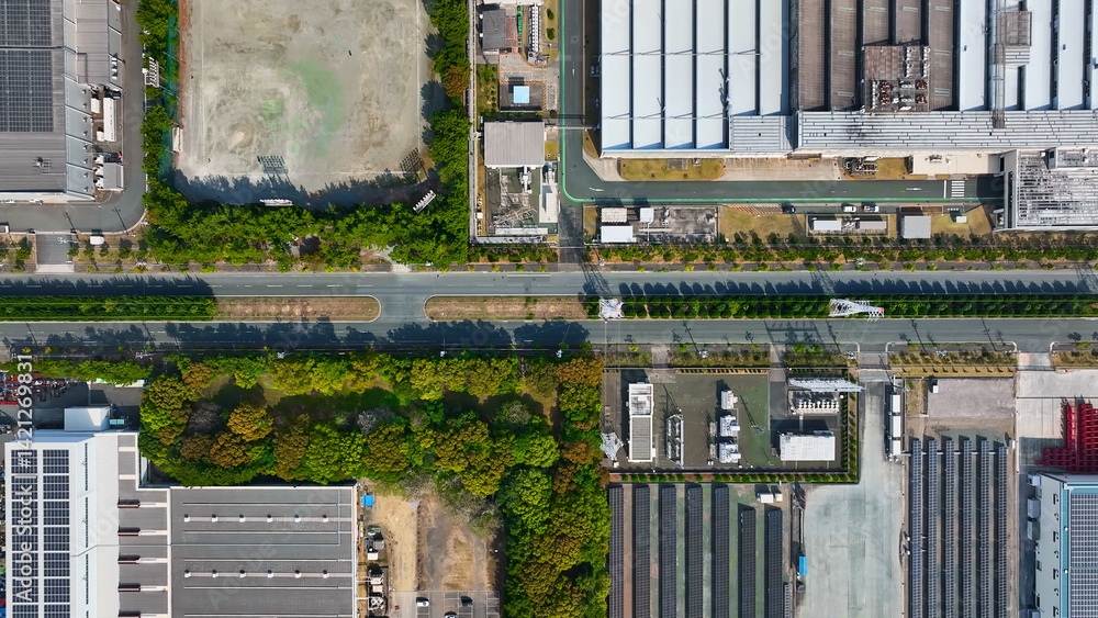 工場の並ぶ工業地帯の風景 真俯瞰空撮