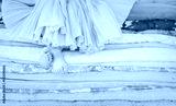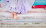 The fairy tale the princess on a pea. Little girl in lilac tatu skirt sitting on the high bed. Bare foot if the girl. Legs of a little girl sitting on a pile of colorful mattresses.