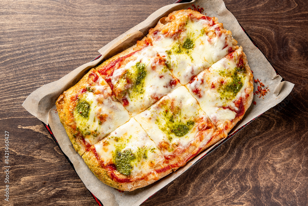 A freshly baked rectangular pizza topped with melty cheese and vibrant green pesto. The golden crust is perfectly crisp, making it an inviting and delicious meal option.