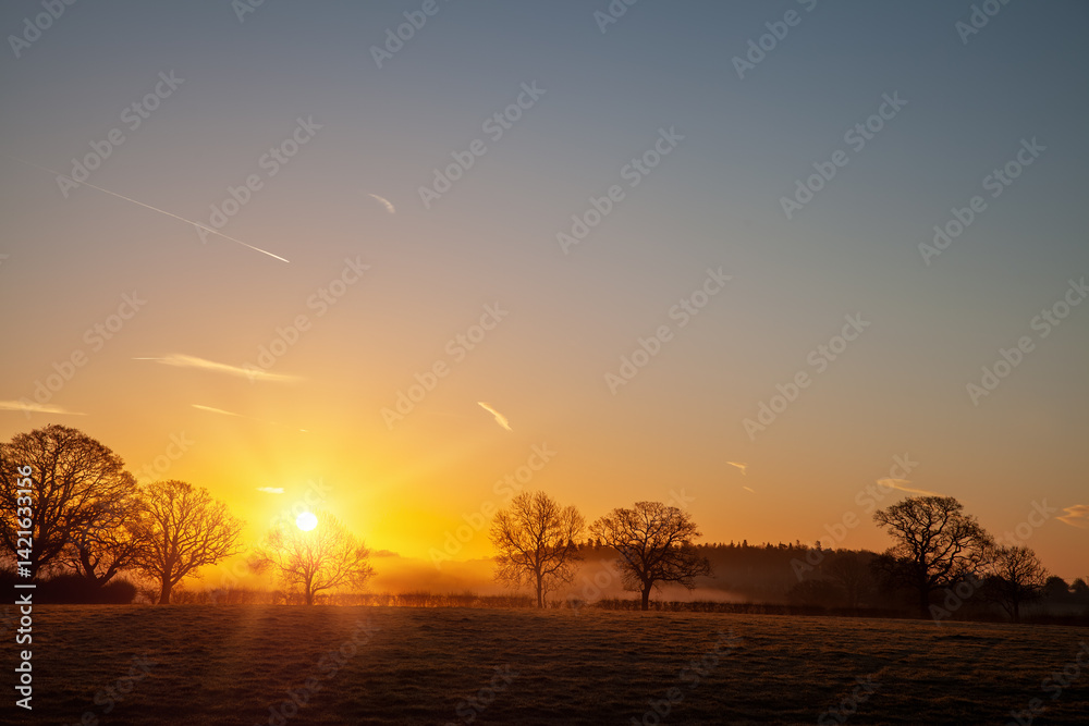 Amazing dawn sunrise through trees in Norfolk England