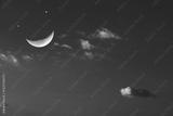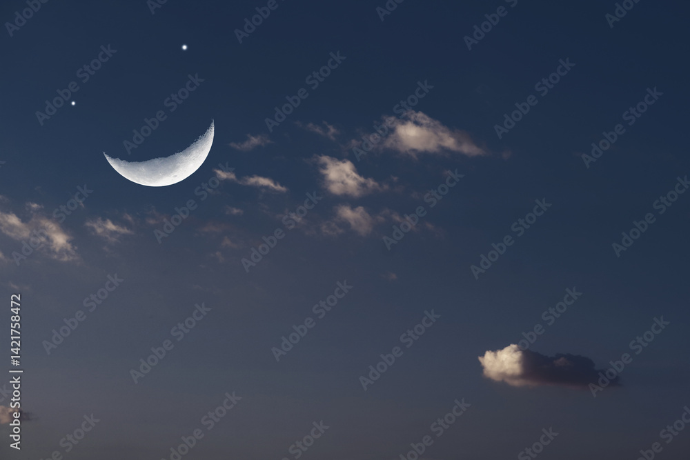 Smiling Moon Serene Night Sky with Crescent Moon and Distant Stars Amidst Clouds