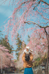 Happy little baby girl in her mother hands looking at camera and smiles over cherry blossom trees in japan, Family playing together outside, Newborn spring concept, copy space