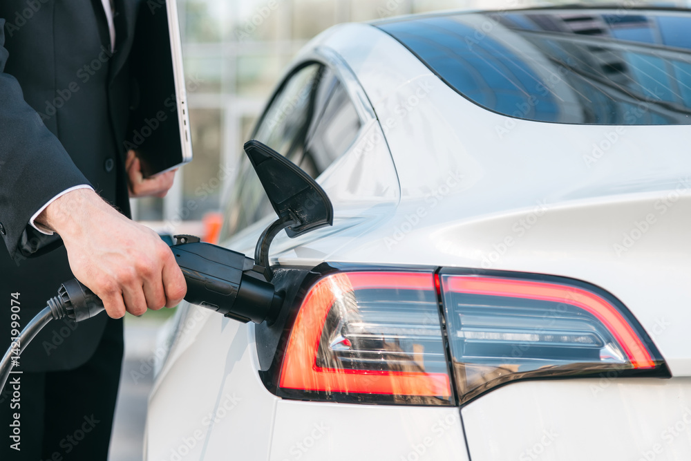 A confident business executive charging his modern electric car near the business center. The concept of ecological transportation and business.