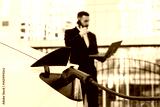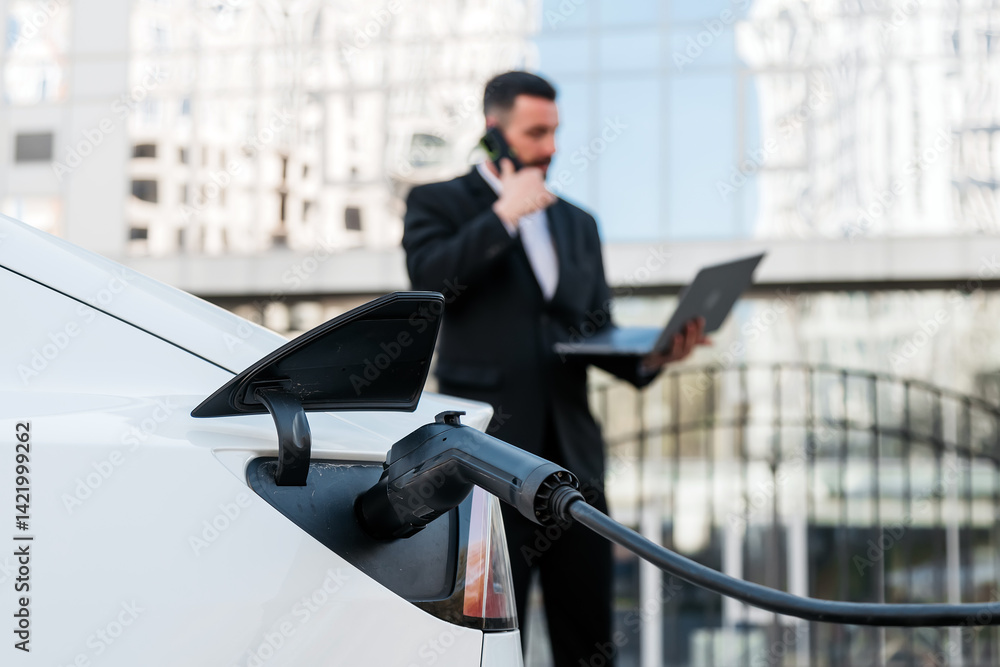 A business man talking on his cell phone while charging the battery of his electric car. A confident man in a business suit near a luxury car. Eco-friendly transportation in an urban environment.