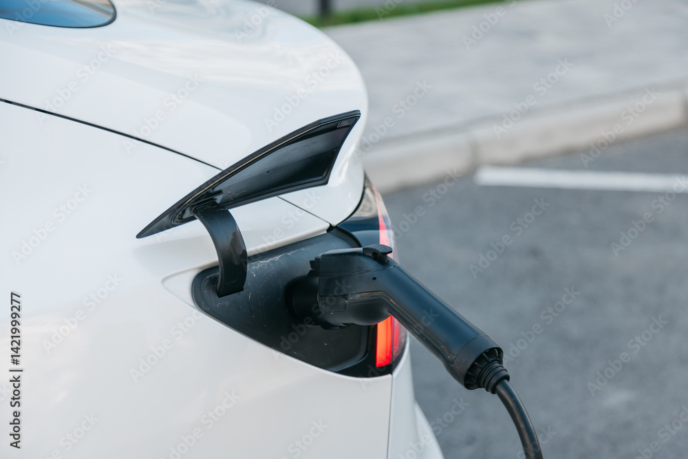 Close-up of a white electric car charging in a street parking. Environmentally friendly transport in the urban environment. Clean energy.