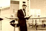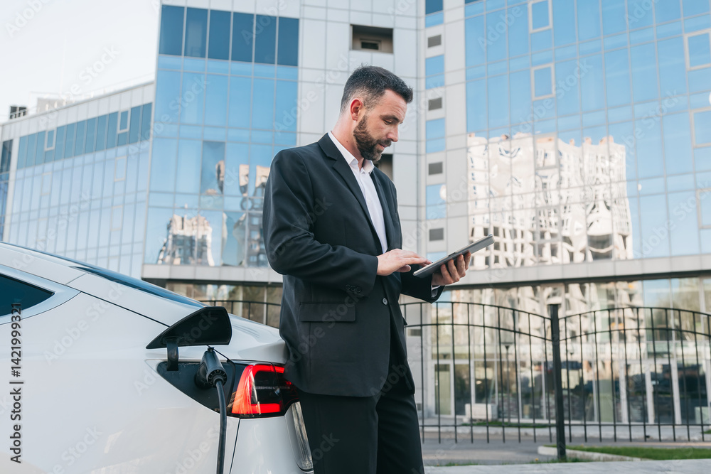 A confident businessman next to his electric car waiting for charging to finish. The concept of clean energy and sustainable development, emphasizing the importance of green technology.