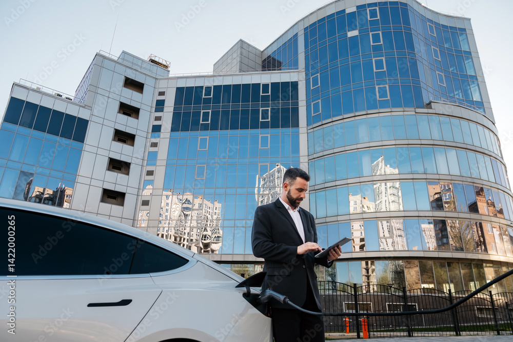 A self-confident businessman using a tablet near the battery charging of his electric car. The concept of clean energy and sustainable development, emphasizing the importance of green technology.