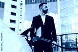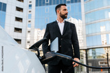 A confident business executive charging his modern electric car near the business center. The concept of ecological transportation and business.