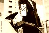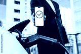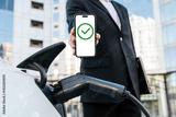 The concept of confirmed or approved status. A businessman next to an electric vehicle at a charging station holding a phone with a screen showing a sign of an approved transfer or payment.
