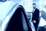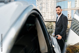 A businessman plugs an electrical connector into his electric car to charge the batteries. Concept of modern cars and eco-friendly charging.