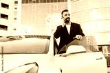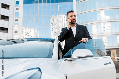 A confident man in a classic suit uses his smartphone near his modern white car. A businessman or driver is having a business conversation on the phone.