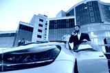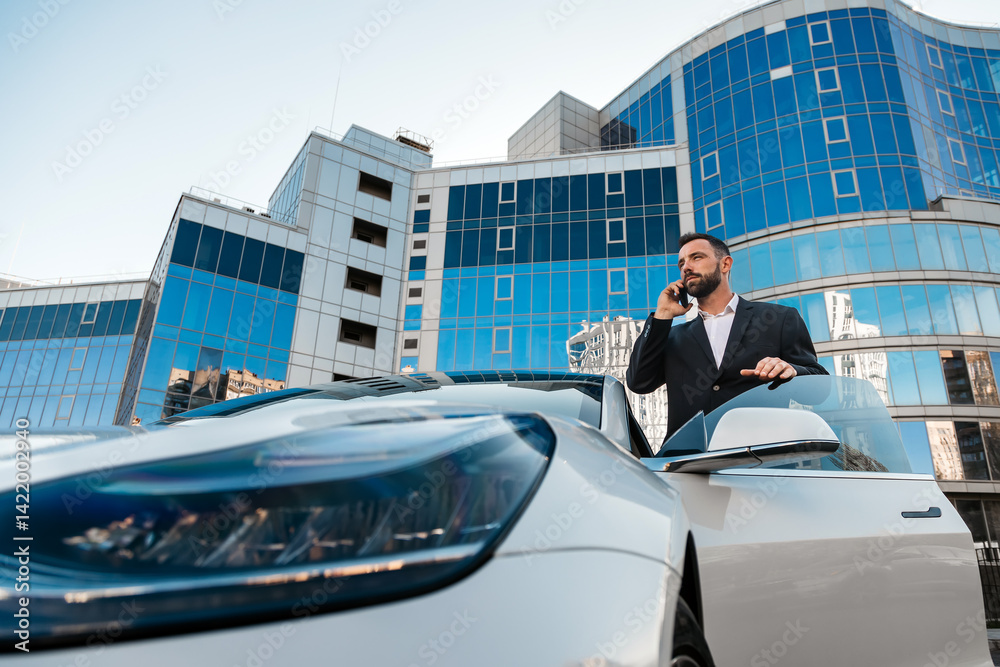 A male entrepreneur talking on the phone against the background of a modern office building near a car. Concept of business travel, communication and technology.