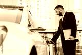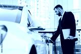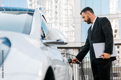 A businessman plugs an electrical connector into his electric car to charge the batteries. Concept of modern cars and eco-friendly charging.