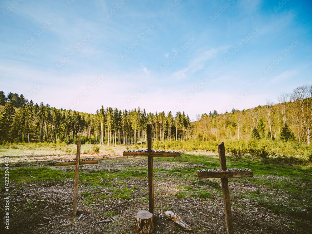 Christliche Kreuze zu Ostern in einem Wiederaufforstungsgebiet im Mischwald