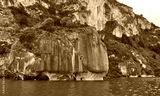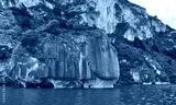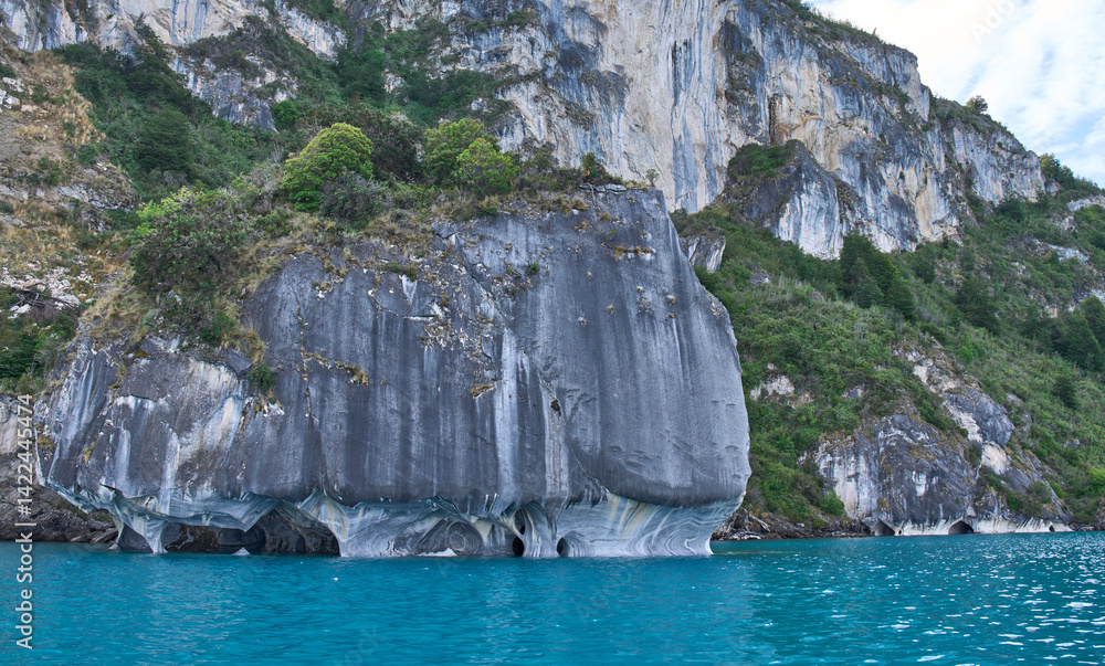 Marble Caves, the most beautiful natural sight in General Carrera Lake in Chile. Surreal rock formations. Curved walls covered in unique patterns. Reflected blue light from turquoise water. Boat tour.
