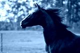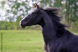Black Arabian Horse Stallion galloping in meadow, head closeup, flying mane.
