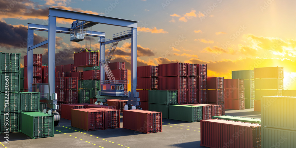 Cranes and stacked shipping containers at a busy port terminal during sunset, showing cargo handling operations and international logistics – Customs. Warehouse.