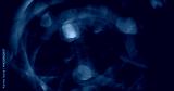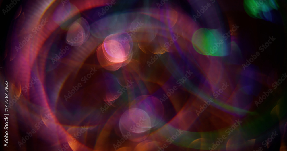 Defocused reflection. Festive beam. Color sparkling shining particles lens flare motion on blurred bokeh light background.
