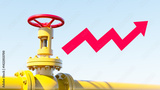 Gas pipe with up arrow. Energy price growth chart. Increase in gas costs. Yellow pipe with pressure valve. Rising propane prices. Pipeline for gas import. Rising prices for pipeline oil. 3d image