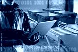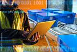 Warehouse automation specialist. Laptop in hands of logistics developer. Cropped man near warehouse conveyor. Programmer writes code while standing in warehouse. Factory automation software developer