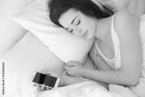 Young woman listening to music in earphones on bed