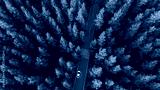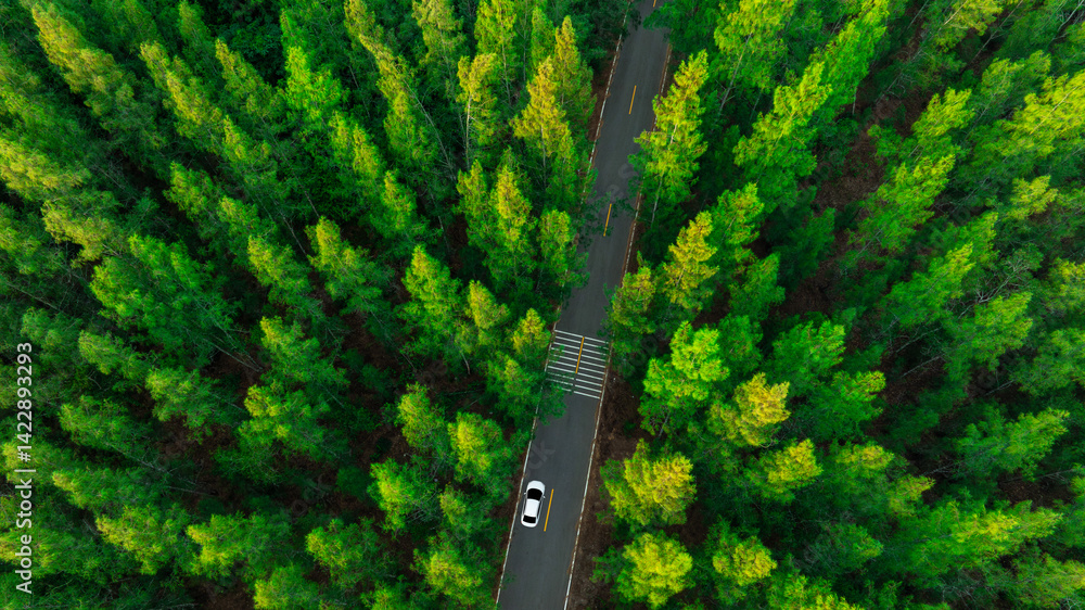 Aerial view of dark green forest road and white electric car Natural landscape and elevated roads Adventure travel and transportation and environmental protection concep