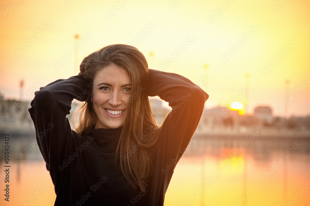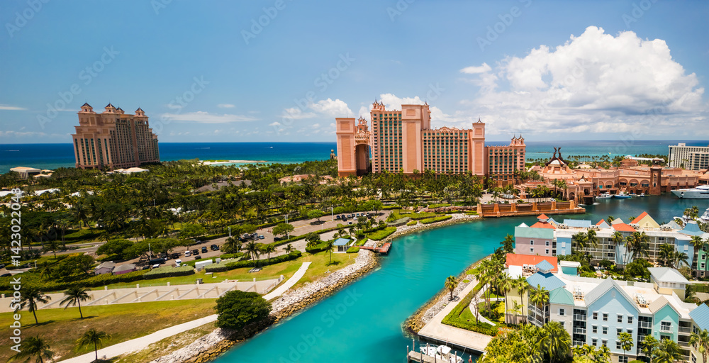 Panoramic view of colorful buildings and resorts at Paradise Island in Nassau, Bahamas.