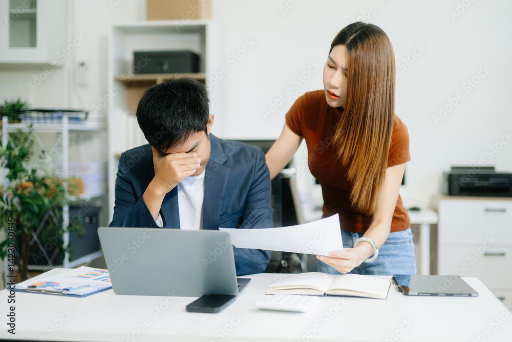Furious two Asian businesspeople arguing strongly after making a mistake at work