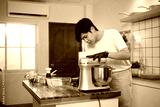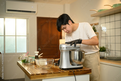 Young asian man preparing whipped cream with a stand mixer in home kitchen