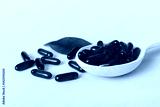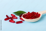Vitamin capsules in a spoon on a colored background. Pills served as a healthy meal. Red soft gel vitamin supplement capsules on spoon