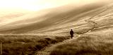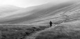 Lone hiker trekking scenic mountain path golden grasses autumn day Perfect for travel adventure and nature themes