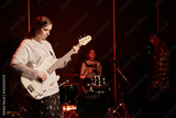 Concentrated teenage female artist playing electric bass guitar under spotlight while performing punk rock music with girls band in recording studio, copy space