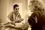 Happy nurse talking to senior woman while checking her blood pressure during home visit.