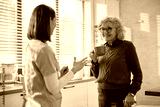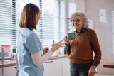 Happy senior woman drinking tea while talking to homecare nurse in kitchen.