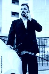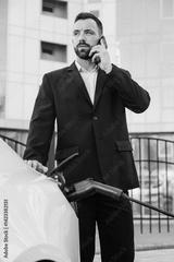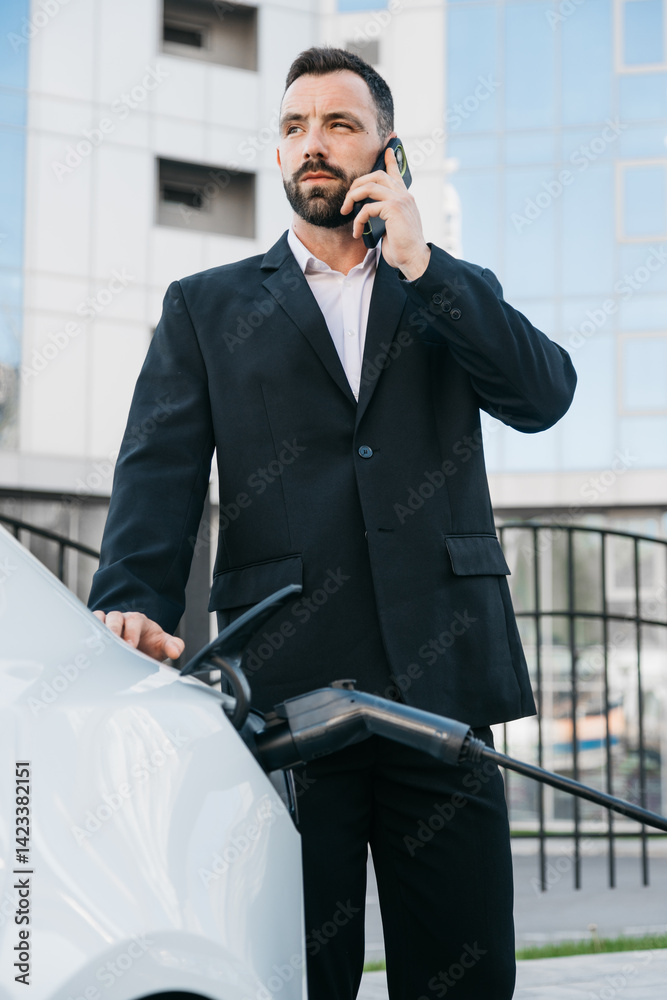 A business man talking on his cell phone while charging the battery of his electric car. A confident man in a business suit near a luxury car. Eco-friendly transportation in an urban environment.