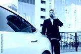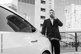 A business man talking on his cell phone while charging the battery of his electric car. A confident man in a business suit near a luxury car. Eco-friendly transportation in an urban environment.