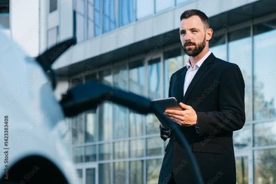 A confident businessman next to his electric car waiting for charging to finish. The concept of clean energy and sustainable development, emphasizing the importance of green technology.