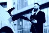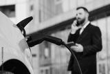 A business man talking on his cell phone while charging the battery of his electric car. A confident man in a business suit near a luxury car. Eco-friendly transportation in an urban environment.