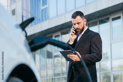 A business man talking on his cell phone while charging the battery of his electric car. A confident man in a business suit near a luxury car. Eco-friendly transportation in an urban environment.