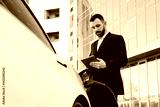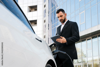 A confident businessman next to his electric car waiting for charging to finish. The concept of clean energy and sustainable development, emphasizing the importance of green technology.