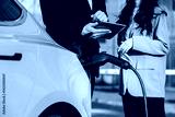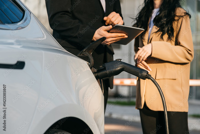 While waiting to charge a modern electric car, a business man and a woman discuss a new project. Modern car concept, business travel.