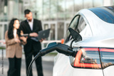 Charging electric car in the background of two business people with laptop. Concept of ecological transport and business.